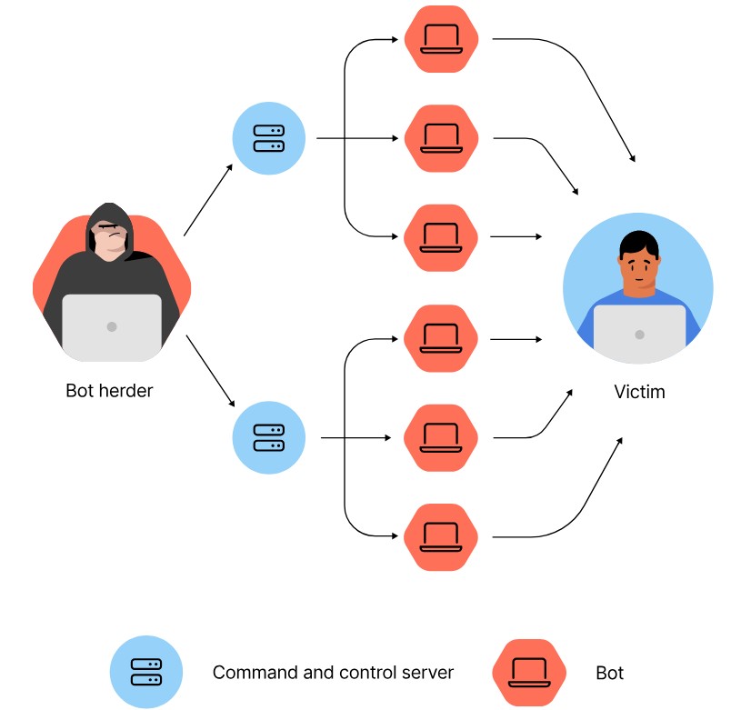 Un botnet est un groupe d’ordinateurs infectés par un malware (un bot) et contrôlés à distance via Internet par le propriétaire du bot. Le cybercriminel contrôlant ce bot est appelé « bot herder » (berger des robots) ou « bot master » (maître des robots). Celui-ci peut contrôler ces ordinateurs « zombies » à partir d’un ordinateur « maître » appelé « centre de commande et de contrôle » (C&C).