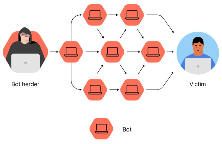 3. Les étapes précédentes sont reproduites avec d’autres victimes jusqu’à ce que le pirate contrôle plusieurs ordinateurs, créant ainsi un réseau d’ordinateurs infectés appelé réseau de bots.